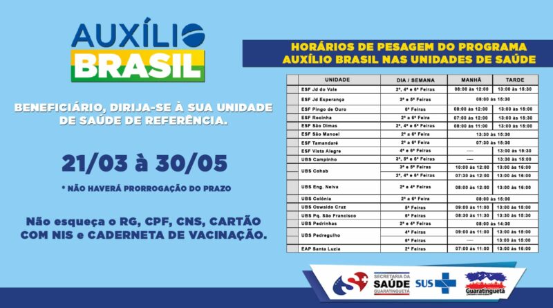 A Secretaria da Saúde divulga cronograma do acompanhamento das unidades de saúde aos beneficiários do Programa Auxílio Brasil (antigo Bolsa Família)