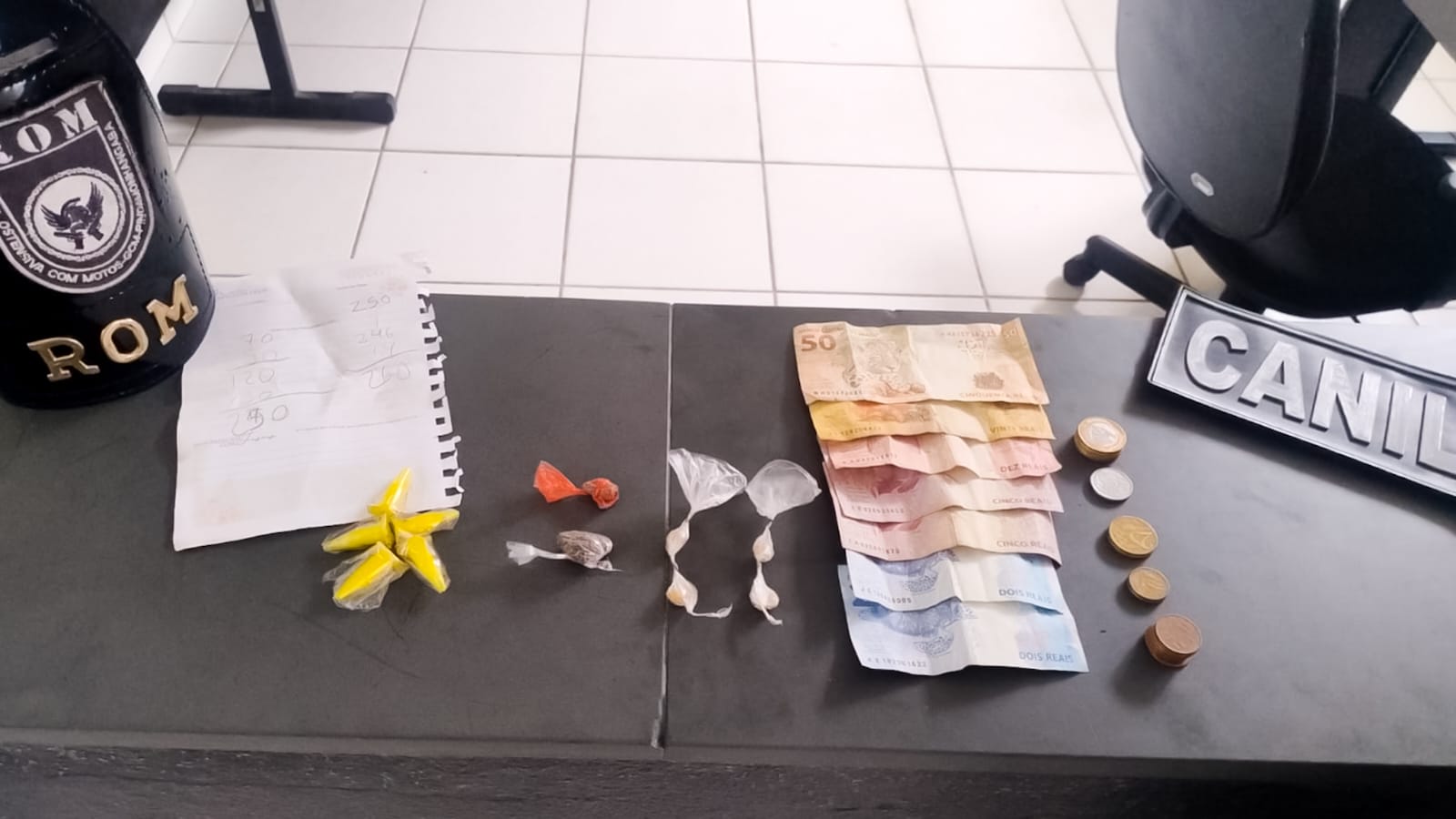 Diante da suspeita, os agentes realizaram a abordagem. Em busca pessoal, foram localizados com o homem três eppendorf contendo substância análoga à cocaína, R$ 100,60 em dinheiro trocado e uma folha com anotações, possivelmente relacionadas à contabilidade do tráfico. Com apoio da viatura do Canil, o cão farejador Bolt localizou, em um buraco no muro a cerca de meio metro do local da abordagem, mais dois eppendorf com substância análoga à cocaína, duas porções de maconha e quatro pedras de crack. Também foram apreendidos uma bicicleta GTSM aro 29 de cor preta e um rádio comunicador modelo KA-8005.