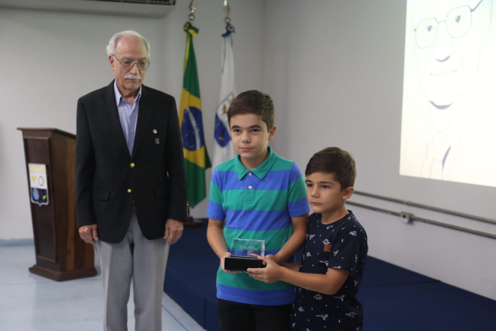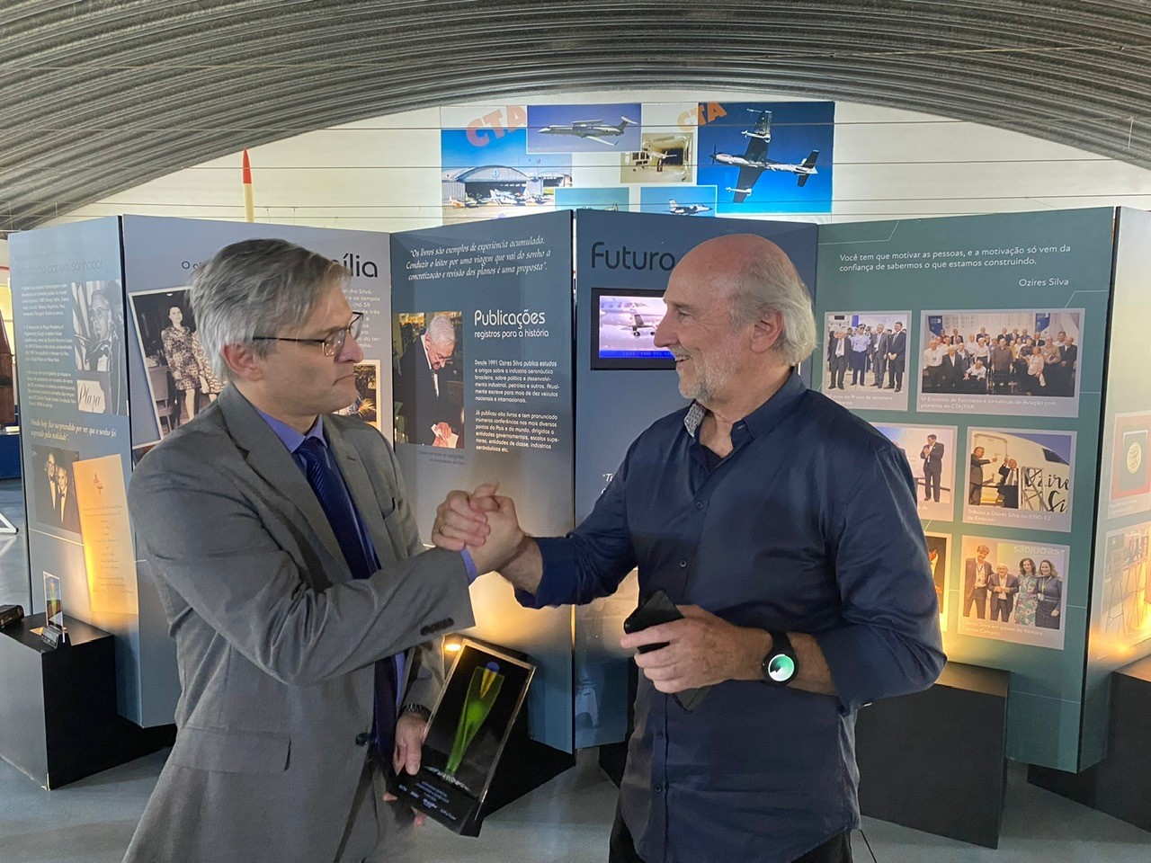 Encerrando a homenagem do INVOZ, foi chamado ao palco o Brigadeiro da Reserva da Força Aérea Márcio Bhering Cardoso, que entregou aos bisnetos de Ozires Silva, Guilherme e Pedro Henrique Pinheiro Royo, um cubo de cristal com gravação 3D do avião Bandeirante, um dos primeiros projetos liderados por Ozires Silva e que impulsionaria a criação da Embraer.