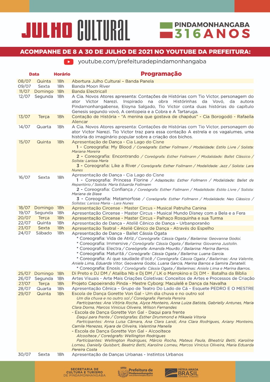 Pindamonhangaba completa 316 anos de emancipação político-administrativa e quem ganha o presente é a população. A Secretaria de Cultura e Turismo da Prefeitura realiza, de 8 a 31 de julho, uma vasta programação cultural online, no canal do Youtube “Prefeitura de Pindamonhangaba”.