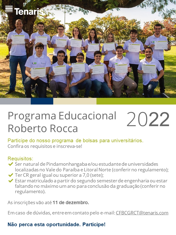 A Tenaris no Brasil, com plantas de operação localizadas em Pindamonhangaba e no distrito de Moreira César, está iniciando mais uma edição do Programa Educacional Roberto Rocca, que todos os anos oferece bolsas de estudos para estudantes universitários de Engenharia da Região Metropolitana do Vale do Paraíba e Litoral Norte, e que tem como objetivo apoiá-los durante o período de graduação. As inscrições são totalmente online e seguem abertas até o dia 11 de dezembro por meio do link: https://bit.ly/